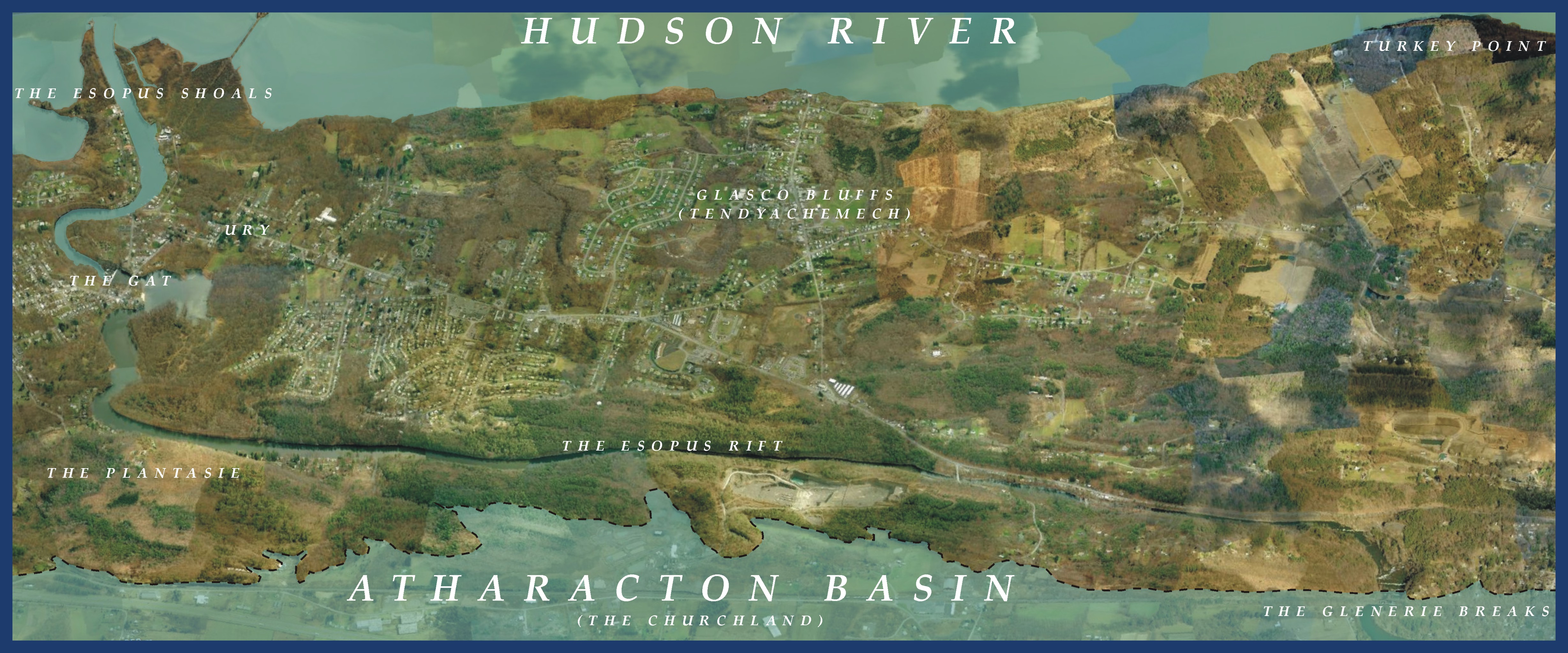 James Eights, M.D., a naturalist scholar in 1835, in the earliest beginnings of the natural sciences, published a study of the landforms between the Catskill escarpment and the Hudson River, following a transit passing through Mount Marion and the Glenerie Falls. This has the first observations on the presence of Lake Albany, the cause of the fissure at Glenerie and the formation of the great Esopus Shoals at Saugerties. The land form of the southern half of Saugerties’ frontage on the Hudson River, between the lighthouse and Turkey Point, was created by two geological formations and one ancient natural event. The west shore of the Hudson is formed of three ridges of dense rock filled with millions of years of deposits of sediments between them. In Saugerties one of these bowls runs the entire length from Flatbush on the southern border north to the Great Vly. Its level fields south of the village were the place of plantations called Tendyachemech where the native inhabitants were first encountered by Henry Hudson. A second bowl is formed west of this between the ridge above the Esopus Rift and the bluestone foothills of the Catskill Mountains. This level formation stretches across the complete southeast base of the Catskills, encompassing all the Churchland in Saugerties and all the Great Plain of Kingston and Hurley. It was the great plantation place the 17th century native inhabitants called Atharacton. This second bowl became the basin of an immense lake at the end of the last ice age, filled with melt-off as the glacier receded. At some early period beyond human memory a break occurred, at Glenerie, in the ridge that formed the eastern wall of this lake. The complete lake drained into the Esopus Rift forming the Glenerie Breaks. The force of this flood gouged out the gorge of the Esopus, ate away at the bend under the Plantesie and swirled past Stony Point to create the formations seen at the bridge and dam of the Village, the rock that inspired Henry Hudson's comments that there was good stone for houses in the Hudson Valley. |