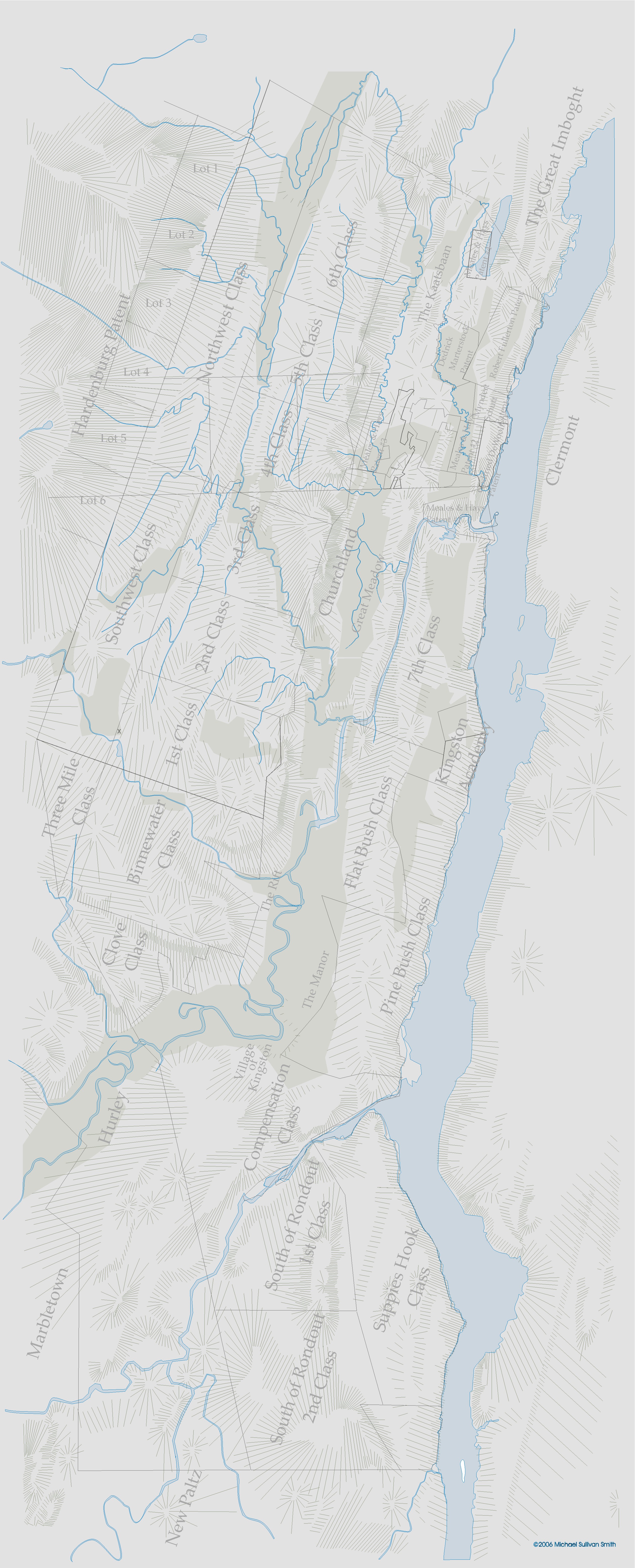 Most of the classes of the survey bear names that go back to the very first encounter with the land. The "South of Rondouts Kill" Class is self-explanatory. The "Clove" Class was adjacent to Hurley north of the City of Kingston. The "Suppies Hook" Class was the Ponckhockie and East Kingston areas. The Pine Bush” Class is the Kaleberg hills around Lake Katrine. The "Three Mile" Class was the Woodstock border around Zena. The "Binnewater" Class was around Sawkill. The "Flatbush" Class included the frontage along the River and up to the Saugerties border.