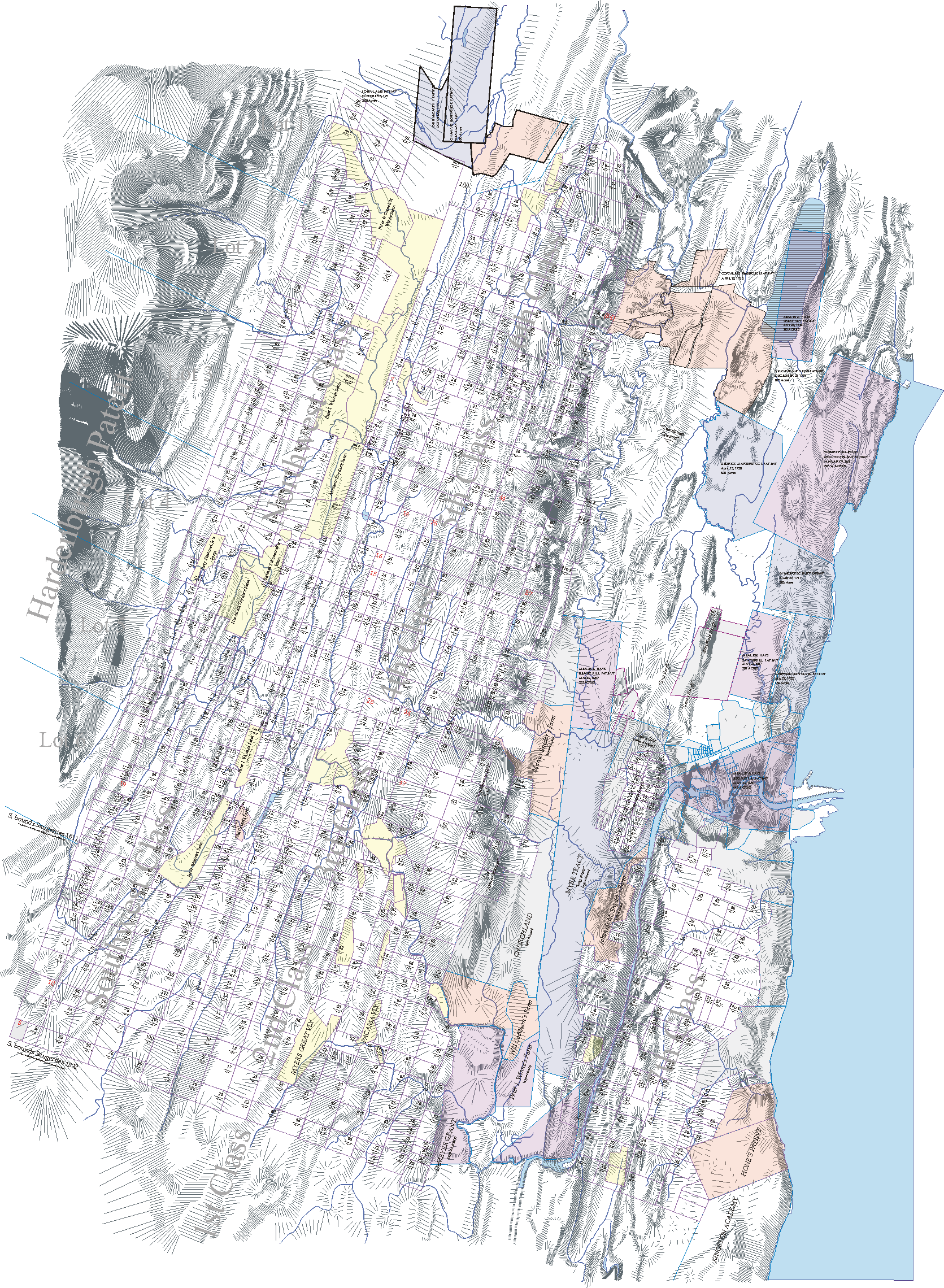 The second phase of the 1803 survey divided this total town of Kingston into a grid of mostly 30 & 45 acre lots. Locating these lots was made manageable by placing them in large divisions called "Classes".