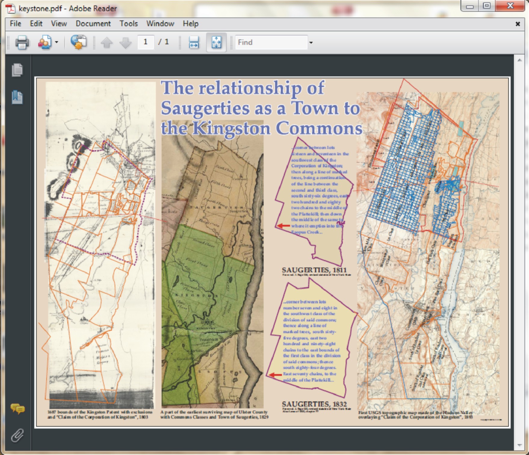 The outline of the map of Saugerties has the appearance of a keystone. Its western border, following the division line between the Kingston Patent of 1687 and the Hardenberg Patent of 1708, uses the 1803 survey for the Kingston Commons' Northwest and Southwest classes and adjacent lots of the Hardenburgh lands up the Catskill escarpment to make this keystone outline. That keystone look is not what actually makes the shape of this outline a “key”. The orientation of the left bottom right-angle corner in its description as that of a lot of the Kingston Commons is. The PDF illustrates the expansion of the town as more of the lots are added and its description continues to cite this relationship to the Kingston Commons. The composition that appears below the PDF discusses how early maps use cues from the Kingston Commons division that prove the locations of lots built out from this key. This is a web production of Michael Sullivan Smith. It's distributed free of commercial or government platforms from the Cloud. If you find it informative you may be a patron by visiting the Patreon.com link on this introduction page. There you will find a list of interesting creations such as this to add to your electronic collection.The file burns a lot of bandwidth every time it is pulled down from the cloud. Patrons help me pay for this service so that you can save this file from the cloud into your computer. The PDF from this streaming file can be downloaded to your computer. The only good thing to come out of commercial dominance of the Internet is the power it needed in your personal computer to pull off this dominance. Please use what you have and save energy. Save the PDF to your computer if you're going to study this file. Mapping the Kingston Commons